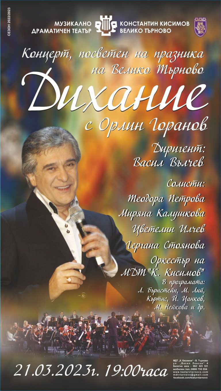 Концерт, посветен на празника на Велико Търново, подготвя екипът на Музикално-драматичния театър „Константин Кисимов“. В музикалния спектакъл под наслов „Дихание“…