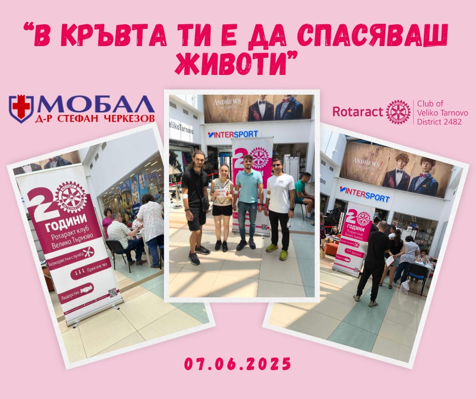 Членовете на Ротаракт клуб Велико Търново за поредна година организираха кампанията по кръводаряване под надслов „В кръвта ти е да спасяваш животи”. В подкрепа на инициативата се включиха 13 човека. Четирима бяха върнати, поради неотговаряне на условията за кръводаряване. Със събраната кръв ще се помогне на поне 13 пациента.