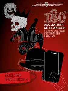 С пърформанса „180° Ако Дарвин беше актьор“ артистите от Музикално-драматичен театър „Константин Кисимов“ във Велико Търново ще отбележат Световния ден на театъра по един нестандартен и интригуващ начин. Нетрадиционната среща с публиката ще се проведе на 28 март от 19:00 и 20:30 часа. Събитието е с вход свободен, но само с предварително записване, като местата бяха изчерпани още пет дни преди обявената дата.