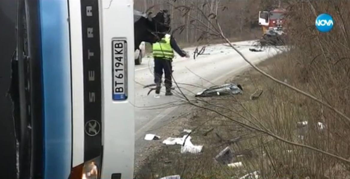Автобусът, превозващ служители на общинската администрация от Лясковец, се е преобърнал настрани на пътното платно. Колата е със софийска регистрация. Тя е смачкана до неузнаваемост, по думите на полицай, който е на мястото на инцидента. Това става видно и от снимката, дело на Нова тв.