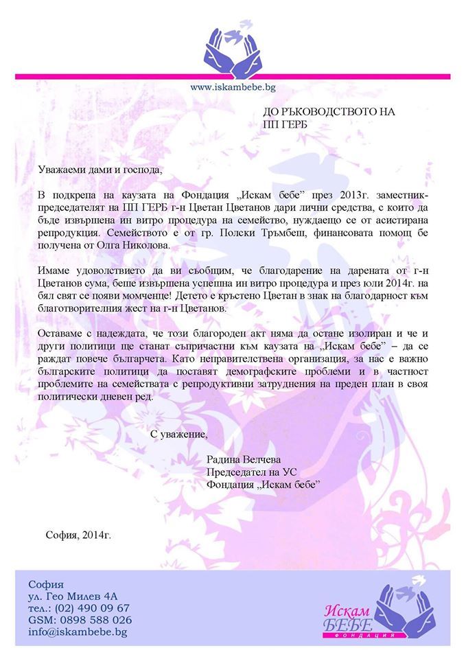 „В подкрепа на каузата на искам бебе зам.-председателят на ПП ГЕРБ г-н Цветан Цветанов дари лични средства , с които да бъде извършена ин витро процедура на семейство, нуждаещо се от асистирана репродукция. Финансовата помощ бе получена от Олга Николова“. Така започва писмото, в което се казва още: „Имаме удоволствието да ви съобщим, че благодарение на дарената от г-н Цветанов сума, беше извършена успешна процедура и през юли 2014г, на бял свят се появи момченце. Детето е кръстено Цветан в знак на благодарност към благотворителния жест на г-н Цветанов“