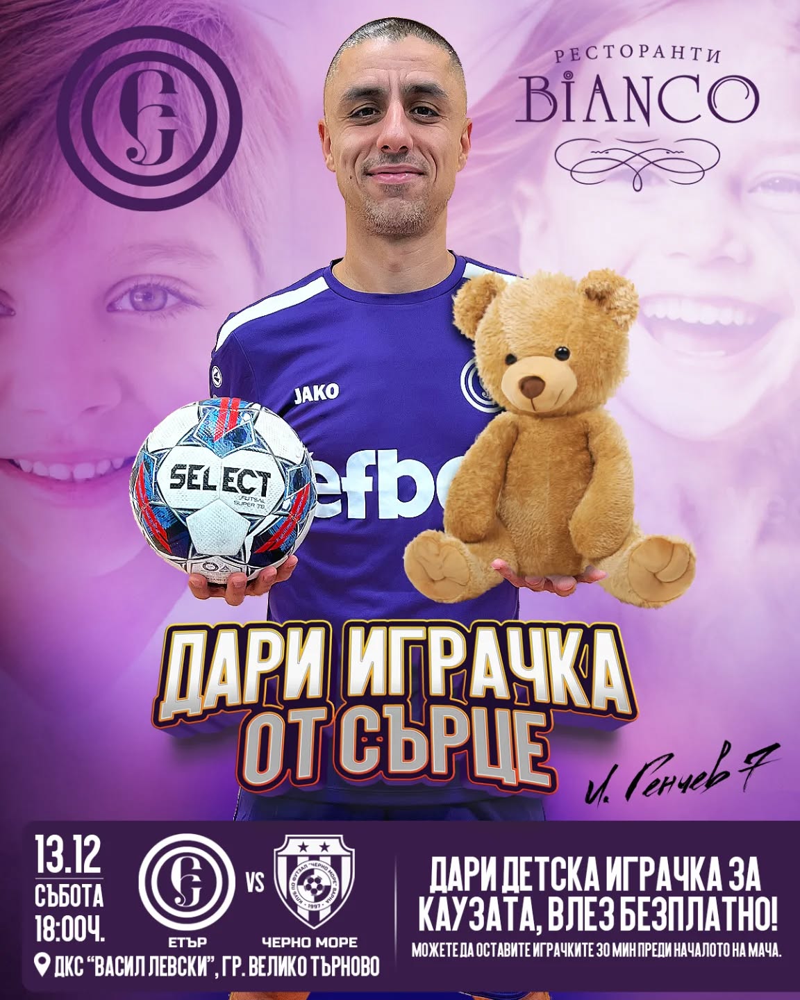 В събота от 18:00 ч. в ДКС „Васил Левски“ по време на мача с „Черно море“ организираме специална благотворителна акция: „Донеси играчка – влез безплатно на мача!“ Всички събрани подаръци ще бъдат дарени на децата в социалните услуги на Община Велико Търново. Заедно с нашите партньори Ресторанти Bianco вярваме, че можем да напълним залата… и да я напълним с добрина. Болярите помагат! Всички заедно! Ела на 13 декември, донеси играчка и стани част от нашата коледна кауза. Подари усмивка, подари надежда!“, обявиха от Футзал клуб „Етър“.