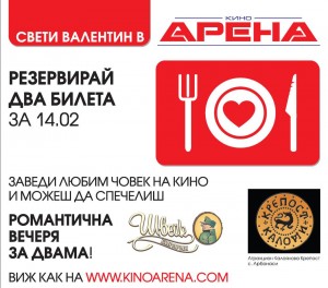 А защо не гледате хубав филм в кино Арена в Сентрал Мол и да заведете половинката си на романтична вечеря и то безплатно. Участвайте в промоцията на кино Арена, като в периода 9-13 февруари резервирате два билета за филм, който искате да гледате на 14 февруари. Заведете любимия човек на кино на 14-ти февруари и платете билетите на касата. Ако сте късметлия, ще получите ваучер за романтична вечеря за двама.