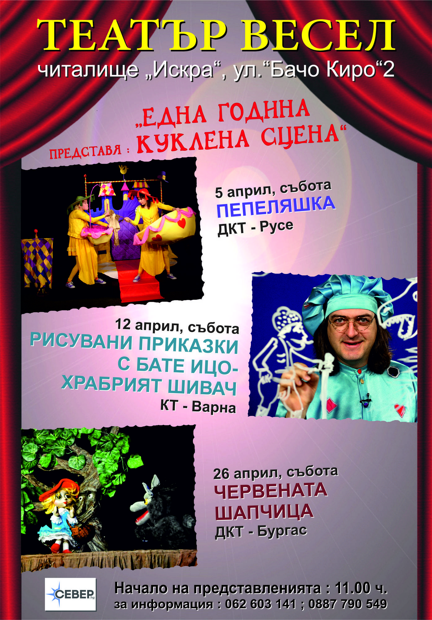 През месец април Театър ВЕСЕЛ ще празнува една година от създаването на куклената си сцена в салона на читалище „Искра” в старата столица. Идеята за „Съботни спектакли за семейна публика” е едно добро начало за „отглеждане” на театрална публика в областния град. Проектът предостави богата палитра от представления, селекционирани от игралните афиши на Куклен театър ВЕСЕЛ и куклените театри от Русе, Сливен, Стара Загора, Бургас, Ямбол, Сливен, Търговище и Габрово. Това разнообразие от спектакли и гостуващи театри дава възможност за възпитаване на художествен вкус у зрителите от различните възрастови групи, формиране на високи естетически критерии в областта на сценичното изкуство, запознаване с образци на класическата и съвременната драматургия за деца и възрастни. Търновските любители на кукленото театрално изкуство получиха своя уникален шанс да гледат над 40 представления от цяла България. Изненадите обаче продължават…