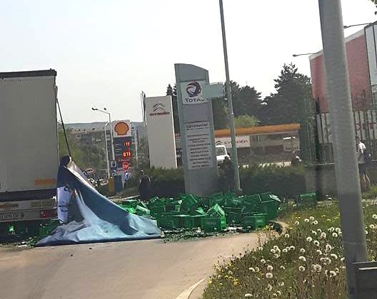 Камион разсипа стотици каси бира на кръговото движение на пътен възел “Качица” преди броени минути. Тежкотоварният автомобил навлязъл с несъобразена скорост в обратния вираж на платното за движение и разсипал касите с пиво.