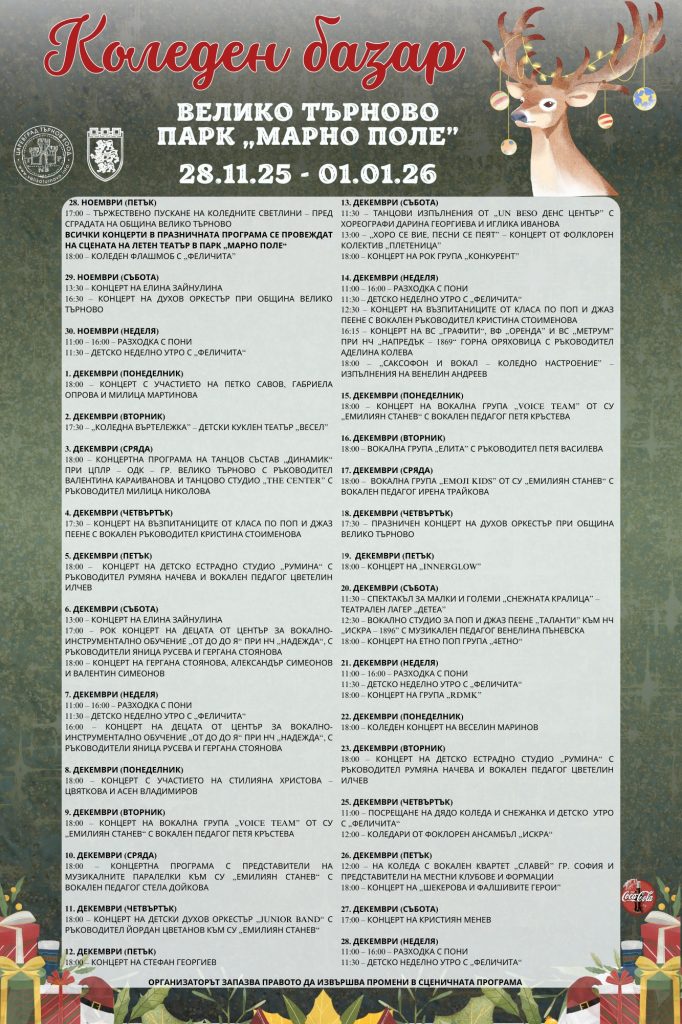 Още по-пъстър Коледният базар във Велико Търново ще стане с богатата музикална програма, подходяща за всеки вкус. Детски вокални групи, солови изпълнителни, духови оркестри, фолклорни състави и популярни български артисти и банди ще повдигнат настроението в старопрестолния град.