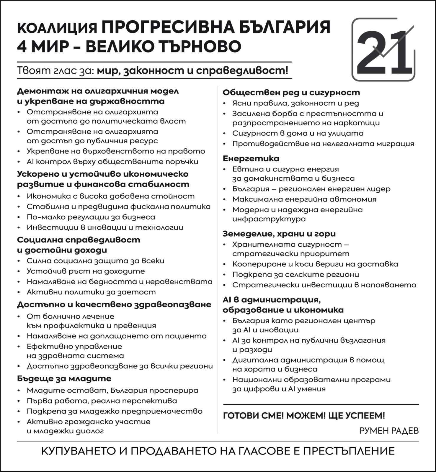 Според ген. Румен Радев решаващата за бъдещето на България кауза е да изхвърлим на парламентарните избори модела „Пеевски-Борисов“ от властта, да му отрежем достъпа до публичен ресурс и да спрем кражбите. „За постигането на тази кауза днес отново искам доверието на българите. Трябва да поправим ужасните последствия от сглобките и сглобкаджиите, които обещаваха, че ще сложат край на този модел, но веднага се съюзиха с него. Които го легитимираха и му поднесоха властта на тепсия и убиха по този начин надеждата на всички ни, че може да има реална промяна, принципи и морал в политиката. Тепърва ще трябва много работа, за да неутрализираме всички тежки последствия от съсипването на българската конституция, което доведе дотам, че дори и изгонено от властта, статуквото пак продължава да я държи чрез „домовата книга“, която въведоха по отношение на служебното правителство. Трябва най-сетне да сложим край на тази арогантност в българската политика. За първи път от много години имаме реалната възможност да променим България. Срещите ни с хората в цялата страна показват, че „Прогресивна България“ ще победи на тези избори, но въпросът е с колко.“