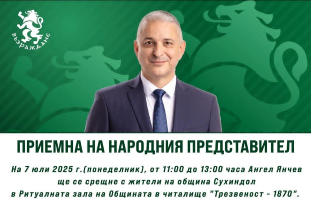 Народният представител от „Възраждане“ Ангел Янчев организира приемна с жители на община Сухиндол на 7 юли (понеделник). Приемната ще се състои от 11.00 до 13.00 часа в Ритуалната зала на НЧ „Трезвеност – 1870“ в Сухиндол.