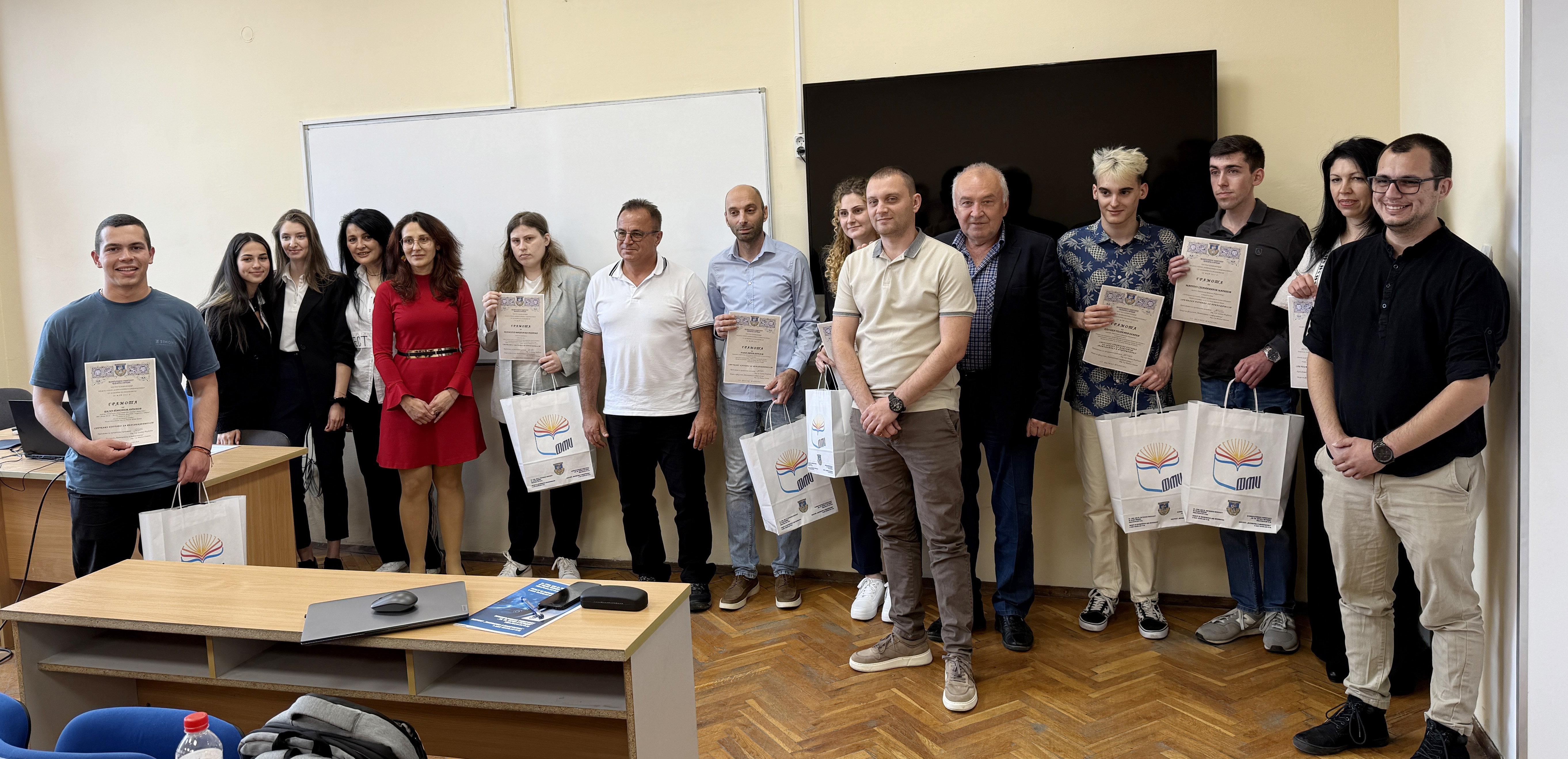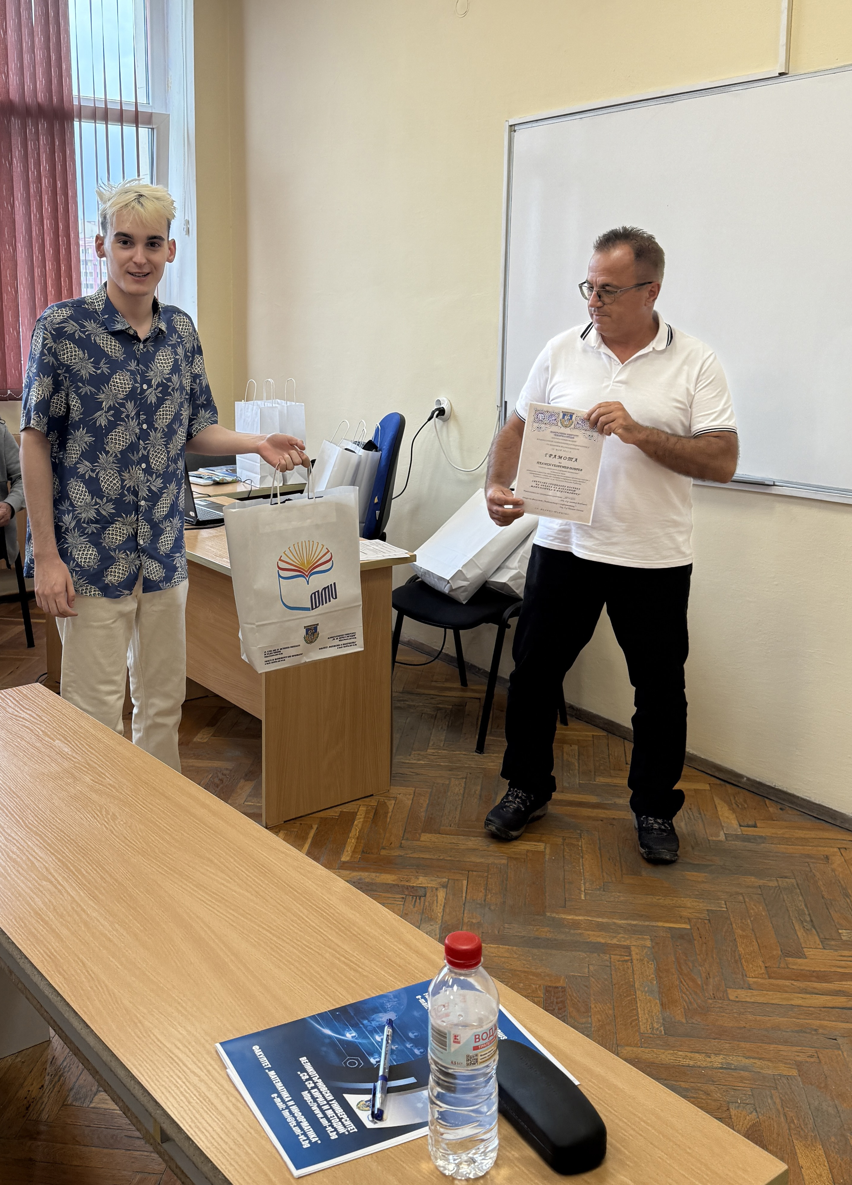 Мартин Станимиров Маринов, специалност „Информатика“, ОКС „бакалавър“, ВТУ„Св. св. Кирил и Методий“ за представен доклад на тема „Уеб базирано приложение „Индиго“ за управление на научни публикации”, научен консултант гл. ас. д-р Васил Бранков Милев