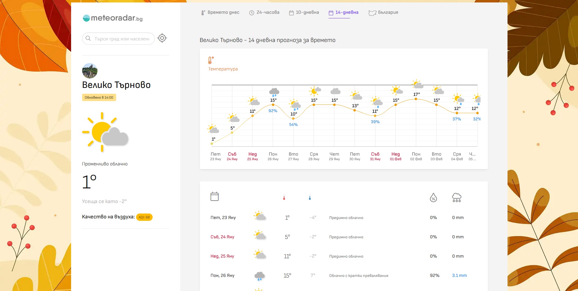 За пълната метеорологична картина и детайли за следващите две седмици, посетете  подробната 14-дневна прогноза за Велико Търново на сайта на Метео Радар.