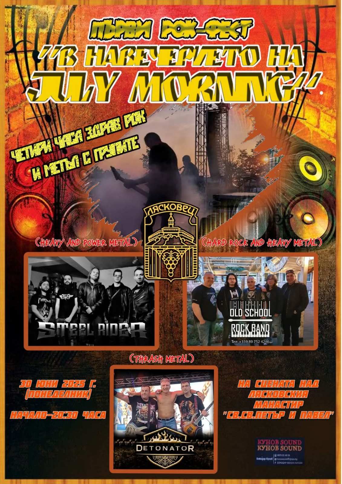 На 30 юни в 20,30 ч. Лясковец ще бъде разтърсен от музикалното събитие „Първи рок-фест в навечерието на July Morning“. То ще се проведе на сцената над Лясковския манастир „Св. св. Петър и Павел“ – там, където протича и годишният събор на овцевъдите в България. Организатор на събитието е Община Лясковец, като целта е този рок фестивал да стане традиционен, да се провежда винаги на 30 юни – денят преди Първи юли, и с него на практика да бъде завършван маратонът от културни събития, свързани с празника на града, който е на 29 юни – Петровден.