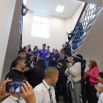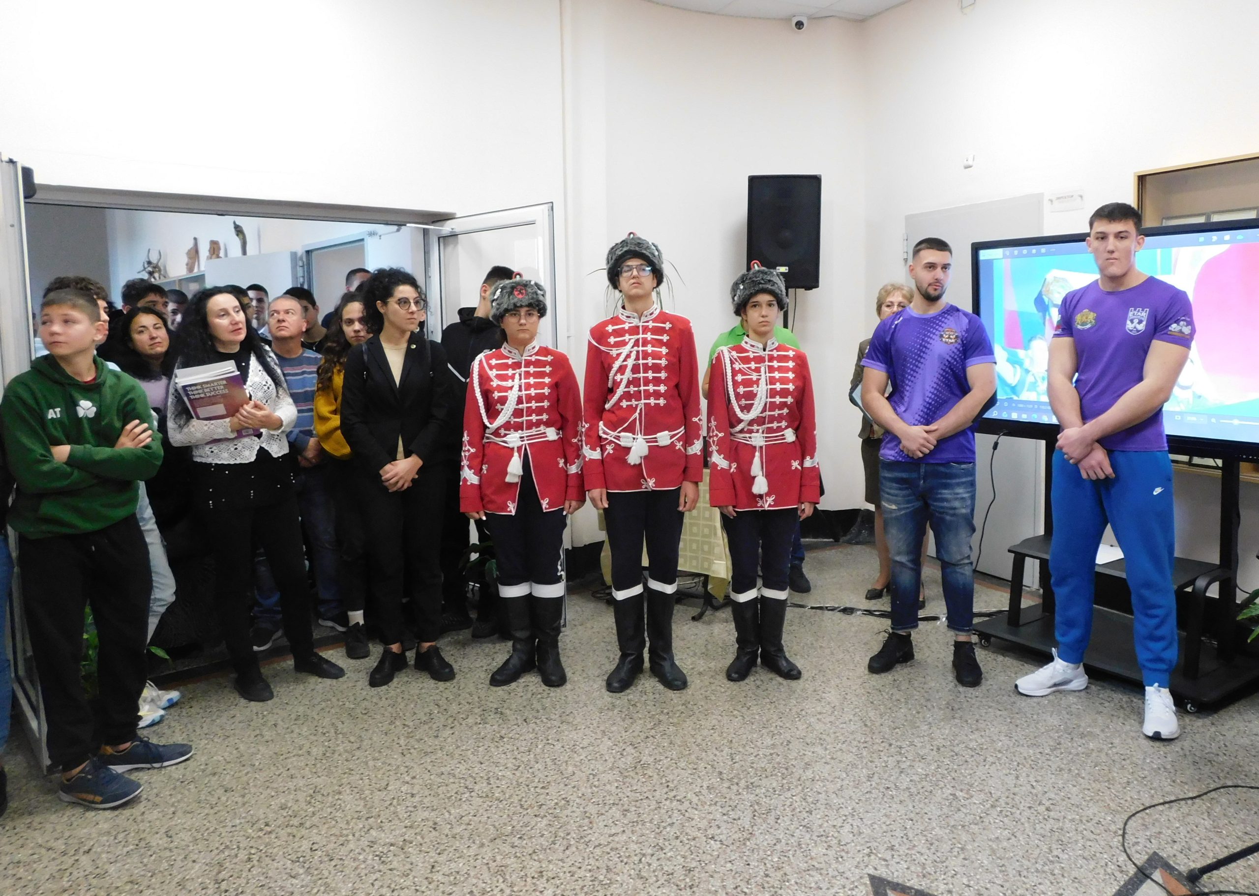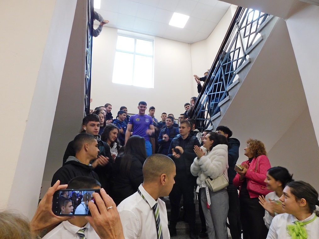 С шпалир и аплодисменти, с гвардейския отряд, както и по традиция с хляб и сол, посрещнаха учениците тримата състезатели по канадска борба. „Нашите ученици прославиха не само гимназията ни, не само Велико Търново, но и България! Не само участваха на световното първенство в Баку, а имаме изключителен шампион и при юношите, и при мъжете. Вилизар и Ивайло са големи мотиватори за всеки един – да покажат как оттук можеш да стигнеш до някой от върховете в света“, каза при откриването преподавателят Евгени Коев.