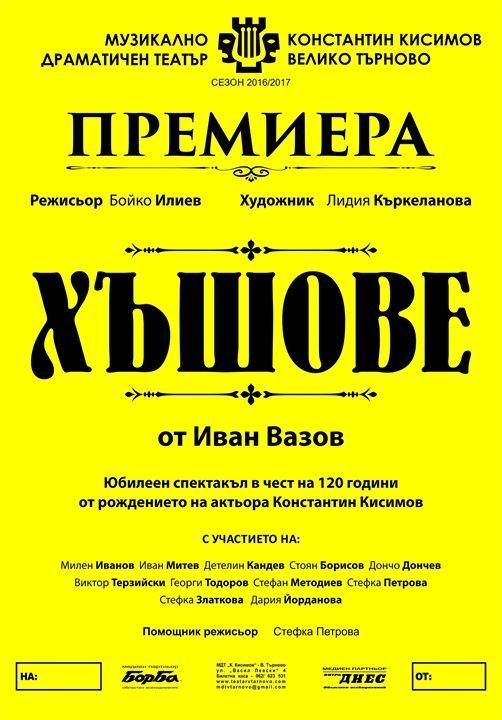 Спектакълът „Хъшове” по мотиви от повестта „Немили-недраги” на Иван Вазов е най-новото заглавие в афиша на Музикално-драматичния театър „Константин Кисимов” във Велико Търново. Спектакълът е посветен на 120-годишнината на патрона на театъра, който е роден на 16 април 1897 г. в старата столица. Премиерата е на 19 април от 19 часа в голяма зала.