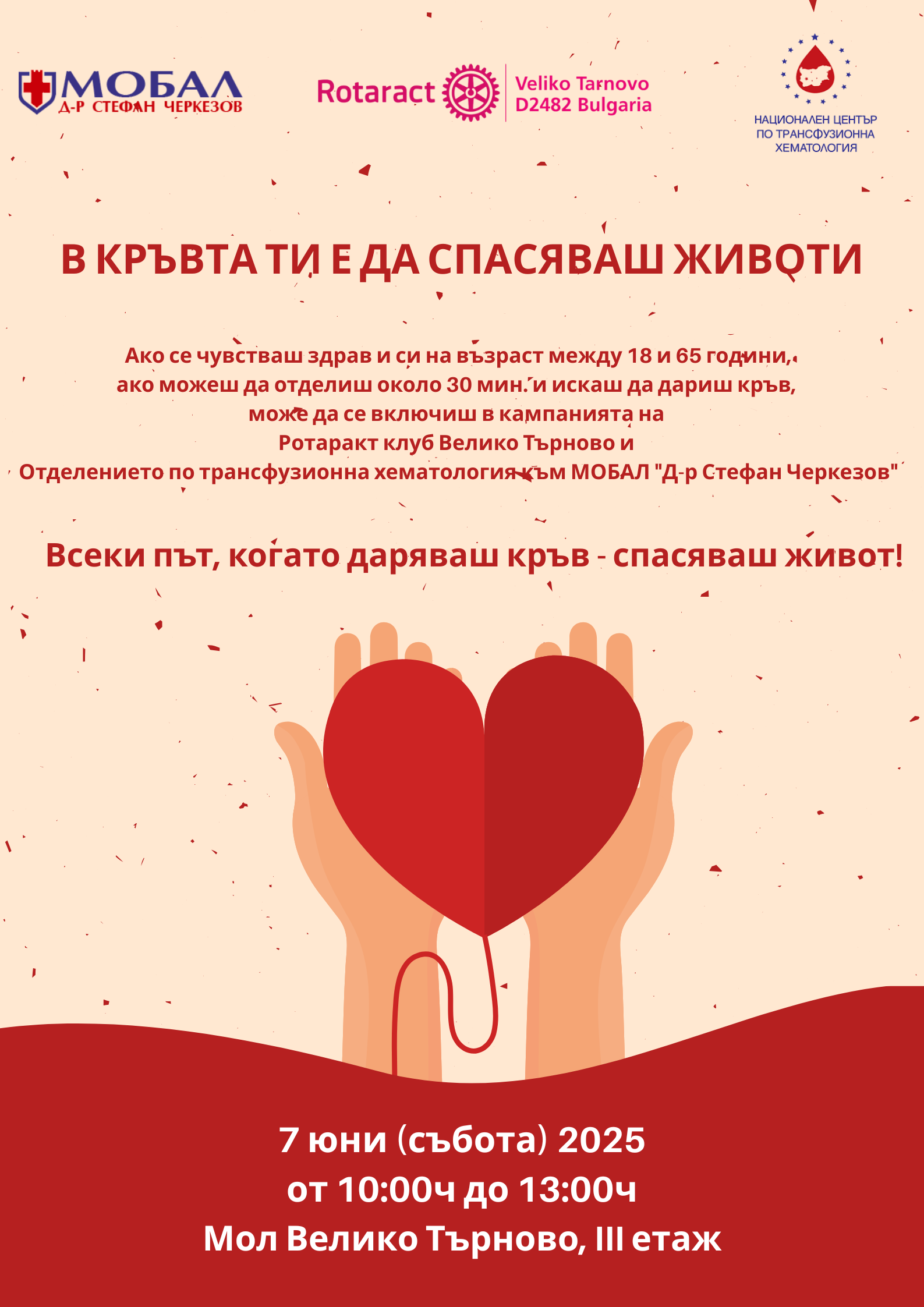 Ротаракт клуб Велико Търново ще проведе кампанията „В кръвта ти е да спасяваш животи”, чиято цел е да подкрепи отделението по „Трансфузионна хематология” (Кръвен център) при МОБАЛ „Д-р Стефан Черкезов”, гр. Велико Търново в осигуряването на необходимия кръвен резерв. Отделението по трансфузионна хематология е единствения кръвен център в област Велико Търново, който обслужва пациенти от всички 10 общини.