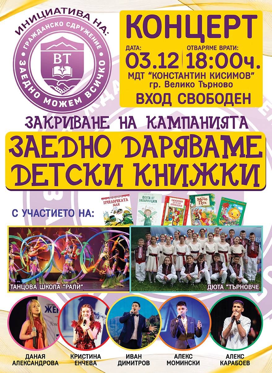 С голям концерт тази вечер от 18:00 часа в залата на МДТ „Константин Кисимов“ – Велико Търново, гражданско сдружение „Заедно можем всичко“ ще закрие тазгодишното издание на благотворителната кампания „Заедно даряваме детски книжки“.