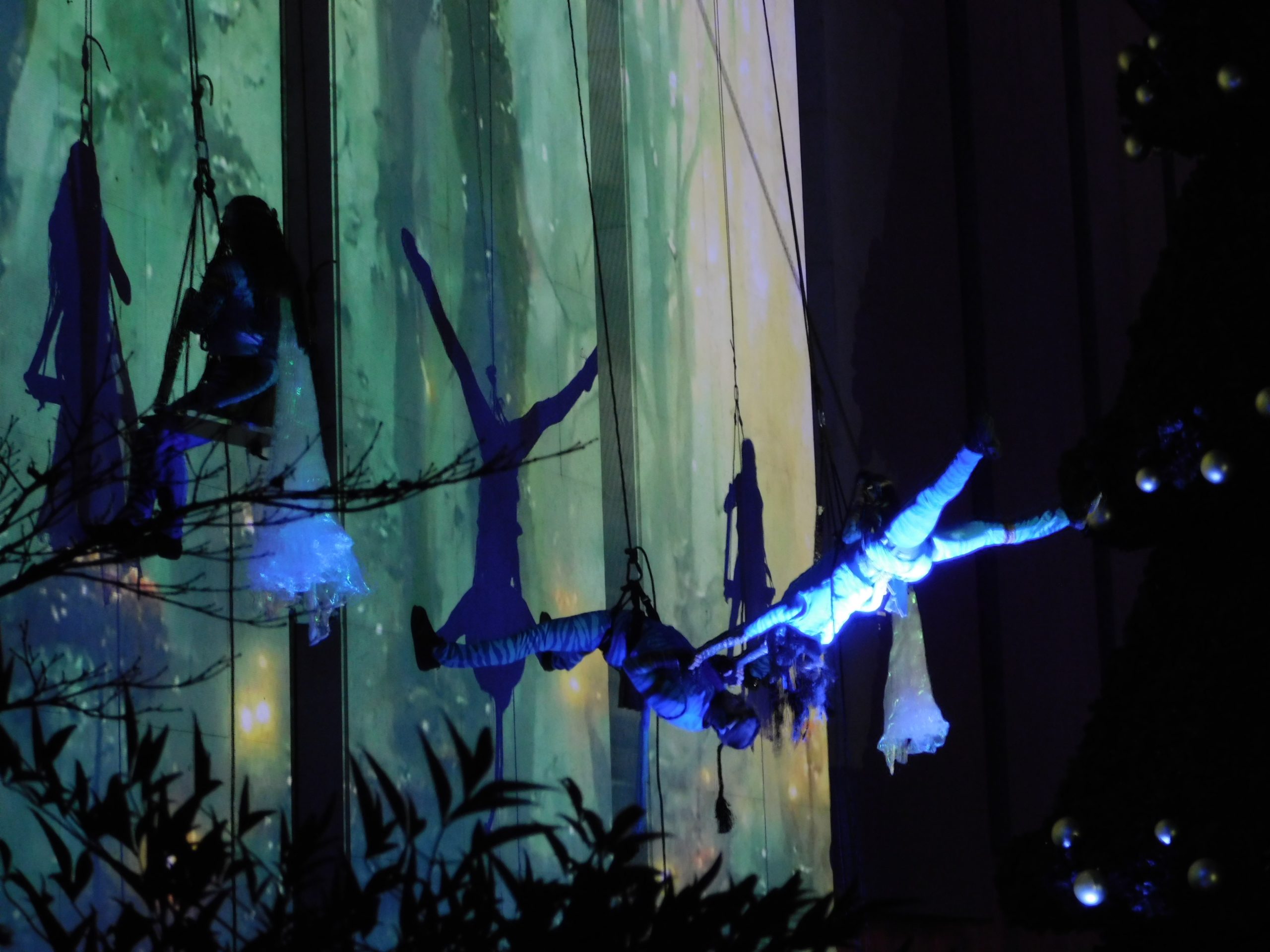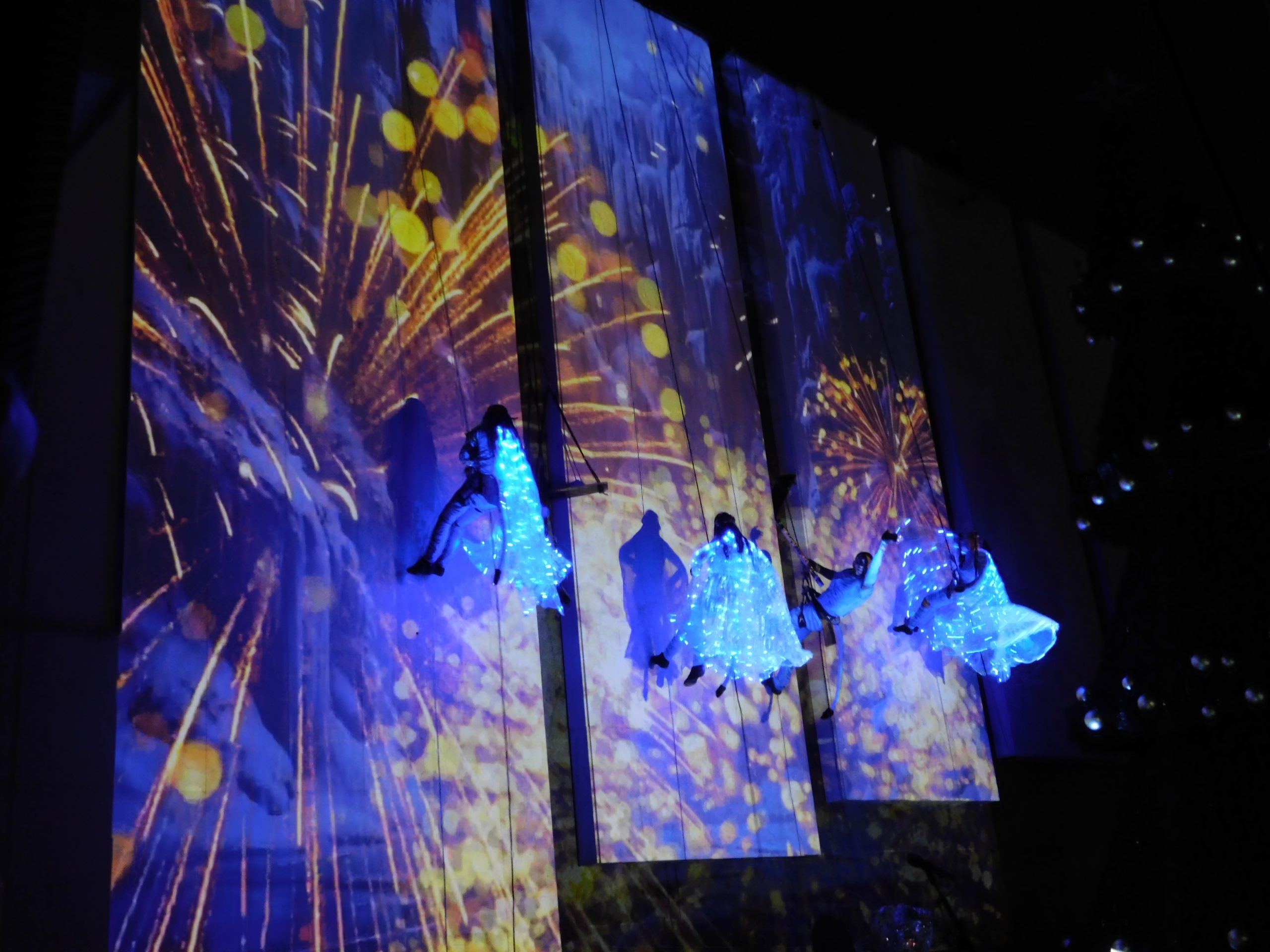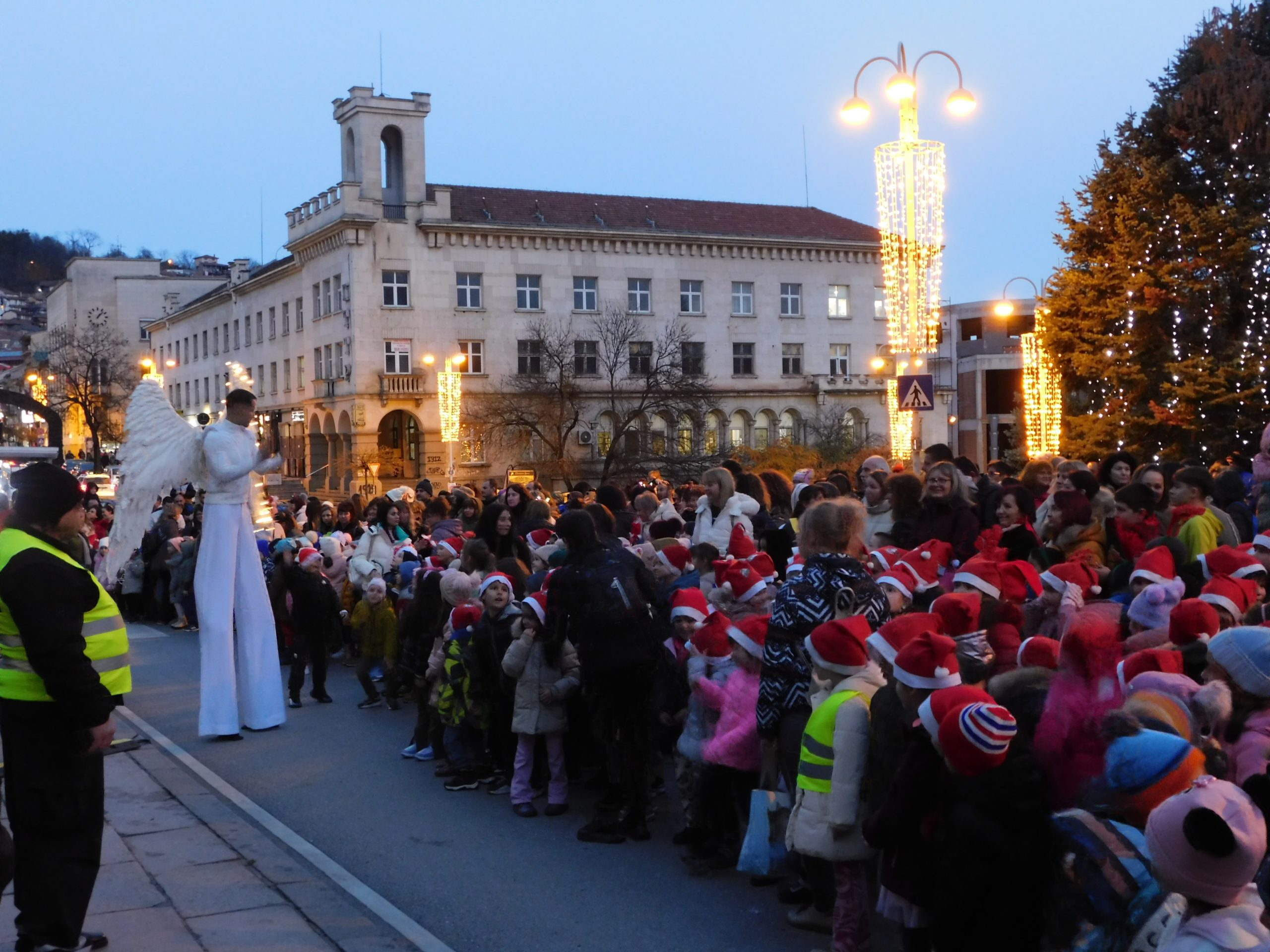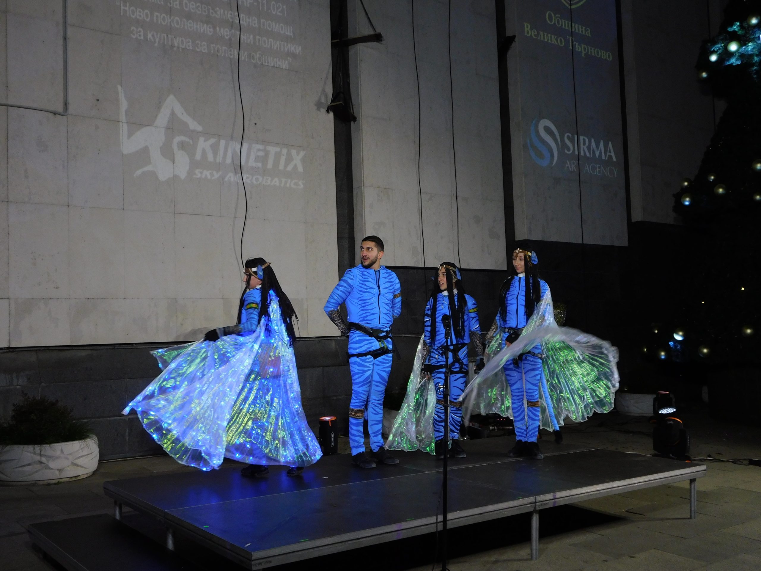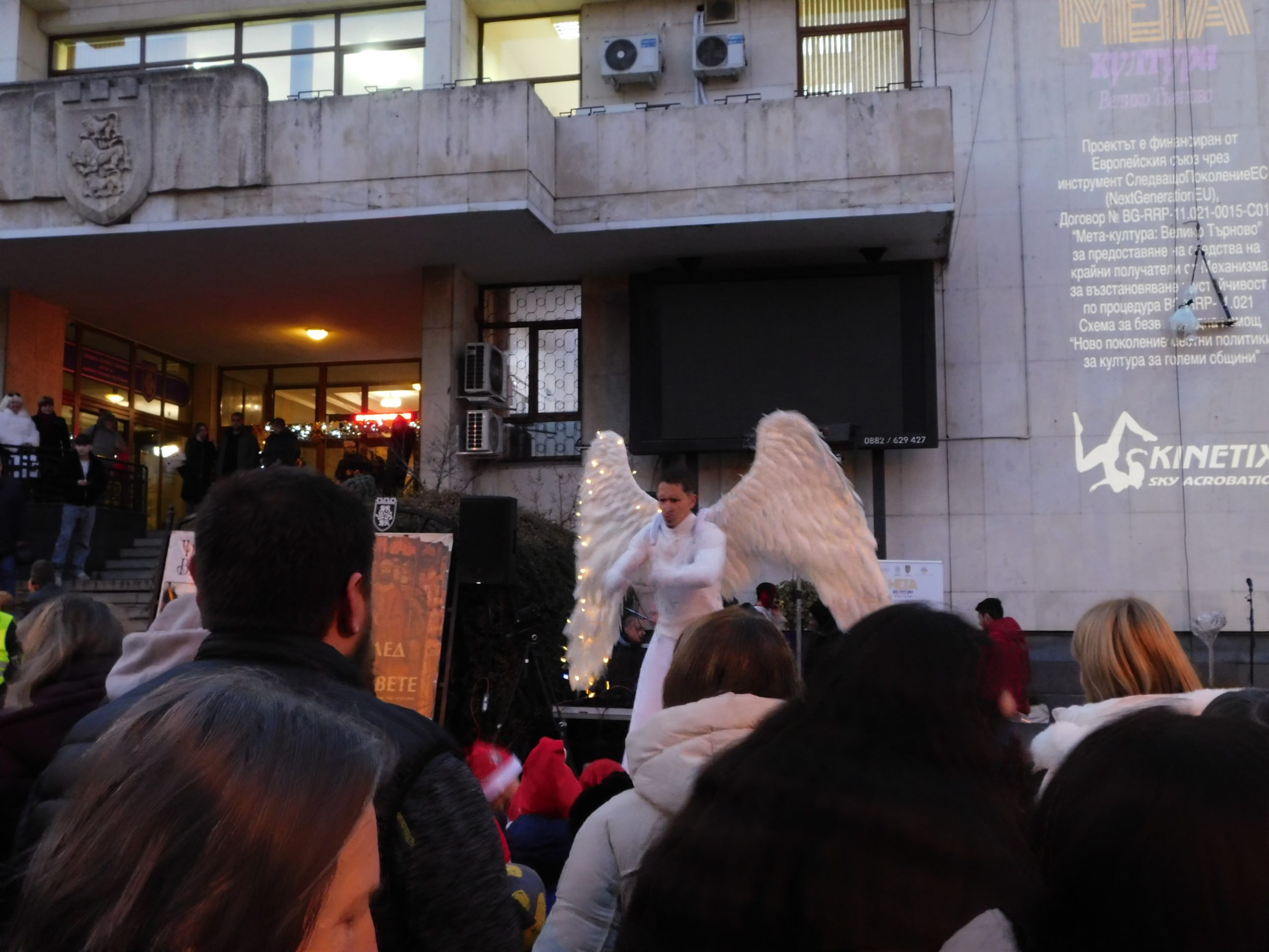 Точно в 17:00 ч. жената-каучук – Сирма Добрева, и артистите от Kinetix SkyAcro направиха коледната атмосфера вълнуваща за стотиците деца пред сградата на Община В. Търново. Ангели на кокили, акробати и танцьори пренесоха зрителите в истинска аудиовизуална приказка, като тяхна сцена беше вертикалната фасада на Общината. Представлението е част от проекта „Мета-култура: Велико Търново“, изпълняван от Община Велико Търново по процедурата „Ново поколение местни политики за култура за големи общини“.