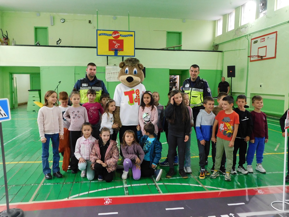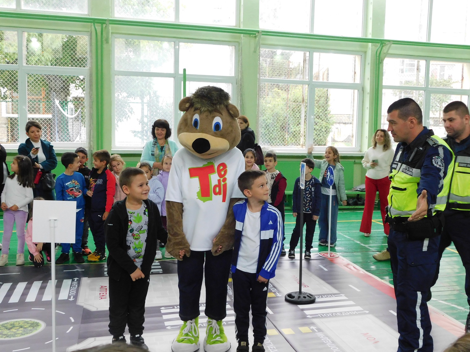 В претворения в пътно платно физкултурен салон – с улици, пешеходни пътеки, пътни знаци, първокласниците първо посрещнаха пътните полицаи. „МВР подкрепя всяка кампания, насочена към пътната безопасност, с цел да намалим пътно-транспортния травматизъм. Безопасността на децата и на всички хора е най-важна за нас. Децата най-лесно се учат с практически занятия, когато го видят и чуят на място – как да се пазят сами и дори как да пазят близките си. Интересно им е, че възприемат правилата първо като игра, а после ги прилагат в реалния живот“, коментира инспектор Георги Василев от „Пътна полиция“ при ОД МВР – В. Търново. Той им зададе въпроси дали знаят къде се пресича, как е нарисувана пеиеходната пътека, за надписите „Погледни!“, пита ги как се пресича пеш, как с колело… После всички заедно извикаха заедно мечето TEDI. Заедно със своя любимец малчуганите се учиха на правилното пресичане на пешеходните пътеки.