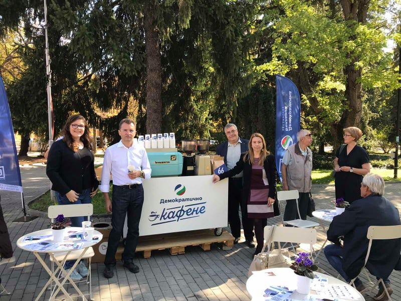 Кандидатът за кмет на старата столица адв. Калоян Янков и кандидатите за общински съветници от „Демократична България“ стартираха оригинална инициатива, която ще протече до последния ден на предизборната кампания. Днес преди обед в парка „Марно поле“ отвори първото по рода си „Демократично кафене“ и за няколко часа стотици граждани изпиха по чашка кафе, капучино и чай като споделиха проблемите на общината. Те разговаряха с адв. Калоян Янков, Елена Чамуркова, Любомир Марков, Якоб ван Бейлен, д-р Христо Димиитров и други представители на листата по различни теми и споделиха мнения по едни от най-наболелите теми за болярския град.