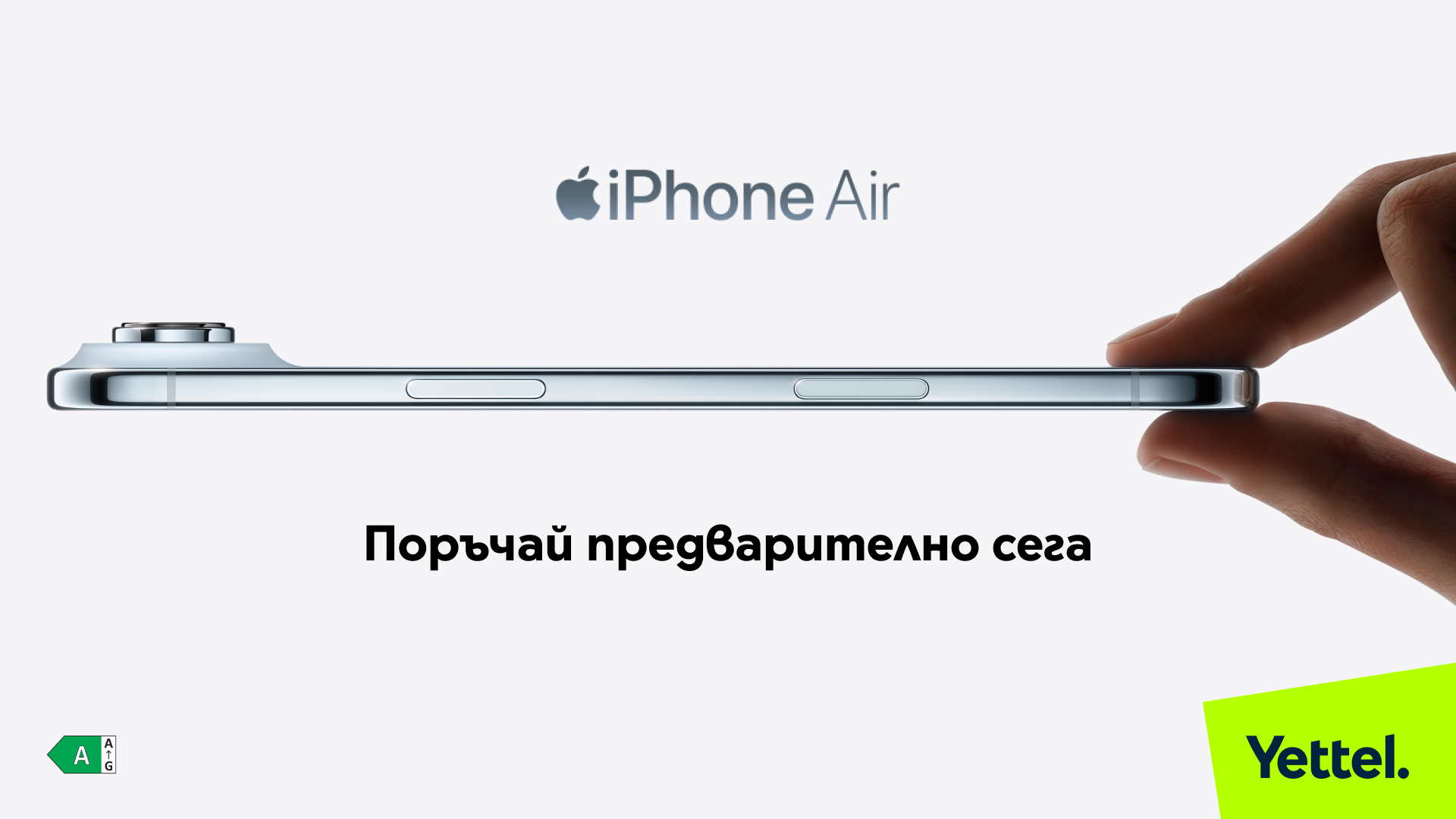 iPhone Air е най-тънкият iPhone, създаван до момента. Дизайнът му е изключително лек, но с по-голяма здравина от всички предишни модели, с усъвършенствани камери отпред и отзад, впечатляващ живот на батерията през целия ден и възможност за удобна активация само чрез eSIM. Той идва в четири цвята – Space Black, Cloud White, Light Gold и Sky Blue. Цената на варианта с памет 256GB е 2034,04 лв./ 1039,99 евро в брой и 96,99 лв./ 49,59 евро на лизингови вноски за две години с план Total Unlimited MAX (с месечна такса 75,99 лв./ 38,85 евро за първите 12 месеца).