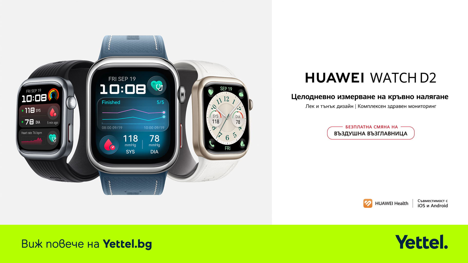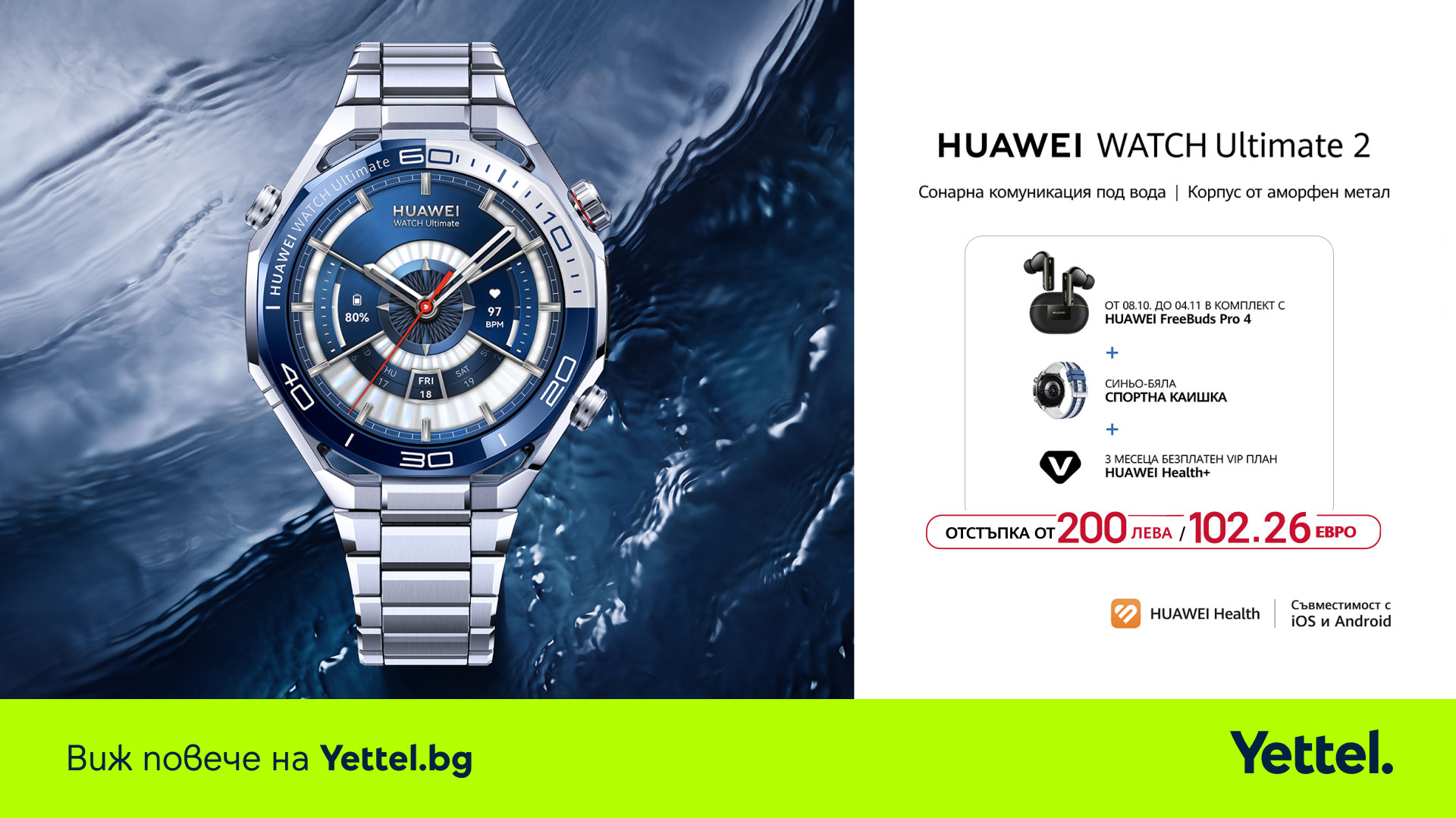 Два от най-новите смартчасовници на Huawei – Watch Ultimate 2 и Watch D2 Blue вече са налични в магазините на Yettel, както и онлайн на Yettel.bg. Watch Ultimate 2 е първият смартчасовник, който поддържа самостоятелно сонарна комуникация под вода, а Watch D2 Blue предлага измерване на кръвното налягане с клинична прецизност чрез иновативна въздушна възглавница, вградена директно в каишката.