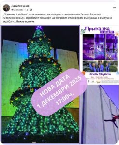Запалването на коледната украса на Велико Търново и акробатичното шоу “Приказка в небето” с нова дата – на 1-и декември от 17:00 ч. пред Общината.