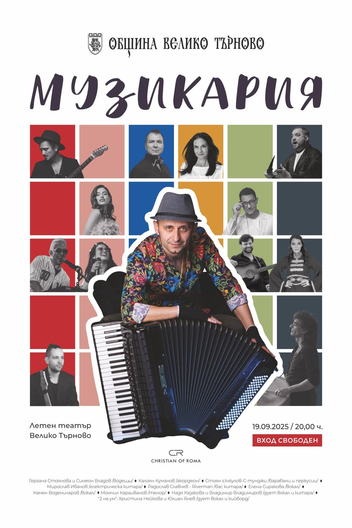 На 19 септември от 20,00 ч. на сцената в Летния театър на Велико Търново ще излязат удивителни актьори и музиканти. Това са Гергана Стоянова и Симеон Владов – водещи и вокали; Камен Воденичаров – вокал; Мирослав Иванов – китара; Стоян Янкулов – Стунджи – барабани; Юлиан Янев – пиано; Радослав Славчев – Riverman – бас; Елена Сиракова – вокал; „2 наум“ – пиано и вокал; Надя Казакова и Владимир Владимиров- пиано, вокал, китара; Момчил Караиванов – тенор и Калоян Куманов – акордеон.