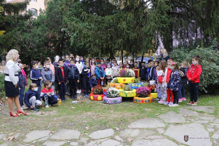 Първокласници и третокласници от Основно училище „Св. Патриарх Евтимий“ във Велико Търново създадоха цветен кът от стари автомобилни гуми. Всяка…